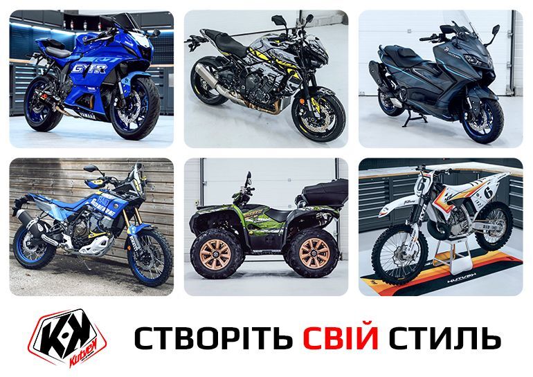Все происходит очень просто: вы выбираете дизайн на сайте, и мы его заказываем и клеим на ваш мотоцикл. А можем и не только на мотоциклы, но и на скутеры, квадроциклы, гидроциклы… Также можете создать ваш собственный дизайн, а специалисты KUTVEK и W-INK воплотят его в реальность! Выделяйтесь!